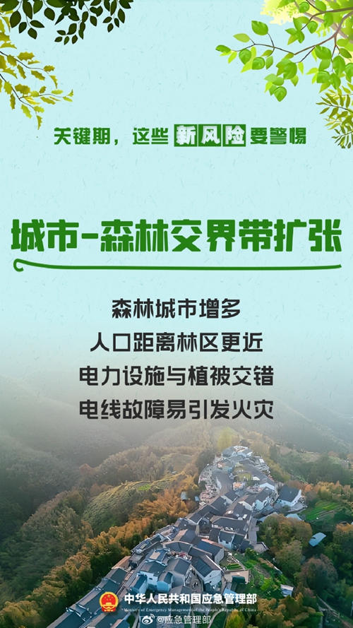 陽春三月,春意盎然。春季氣溫逐漸升高,降水偏少,大風天氣增多。伴隨春耕生產、踏青祭祀等生產生活用火增多,森林火災風險增高。近期,多地陸續進入春季森林防火關鍵期,以下新風險要警惕!