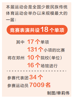 據(jù)競(jìng)賽表演部相關(guān)負(fù)責(zé)人介紹,本屆民族運(yùn)動(dòng)會(huì)競(jìng)賽表演共設(shè)18個(gè)單項(xiàng),馬上項(xiàng)目比賽已于7月12日至17日在呼和浩特圓滿結(jié)束,其他17個(gè)單項(xiàng),131個(gè)小項(xiàng)的比賽將在鄭州10個(gè)院校(單位)、16個(gè)場(chǎng)館進(jìn)行;參賽代表團(tuán)34個(gè),參賽運(yùn)動(dòng)員7009名,是全國少數(shù)民族傳統(tǒng)體育運(yùn)動(dòng)會(huì)舉辦以來規(guī)模最大的一屆。另外,本屆運(yùn)動(dòng)會(huì)還將突出河南省武術(shù)大省的優(yōu)勢(shì),“少林拳”和“陳氏太極拳”等也將一一呈現(xiàn)。