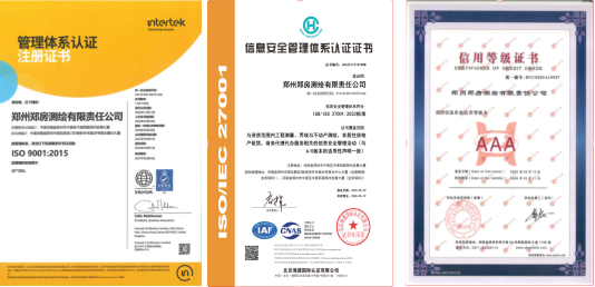 結合2019年取得的質量管理體系(ISO9001),鄭房測繪已成功通過“三標體系”認證。這些榮譽,不僅是公司在規范化運營、風險防控、精細化管理等維度交出的優異答卷,更標志著公司企業綜合實力和核心競爭力的增強,顯著提升公司品牌形象與市場信譽度,增強客戶對企業的信任,為深耕測繪地理信息市場奠定堅實基礎,為開啟管理升級與戰略躍升譜寫新篇章。